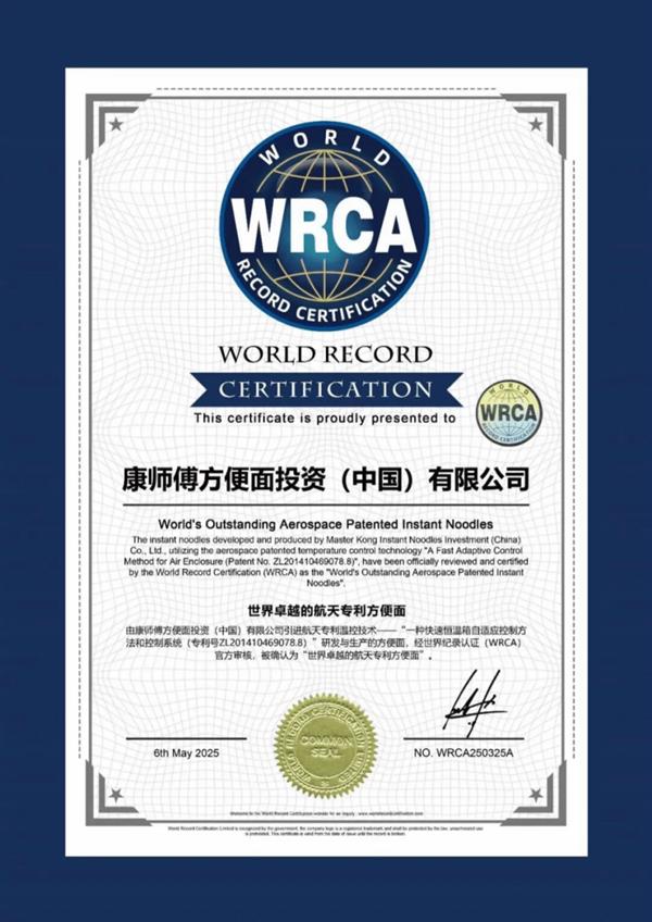 图:康师傅获WRCA“世界卓越的航天专利方便面”认证