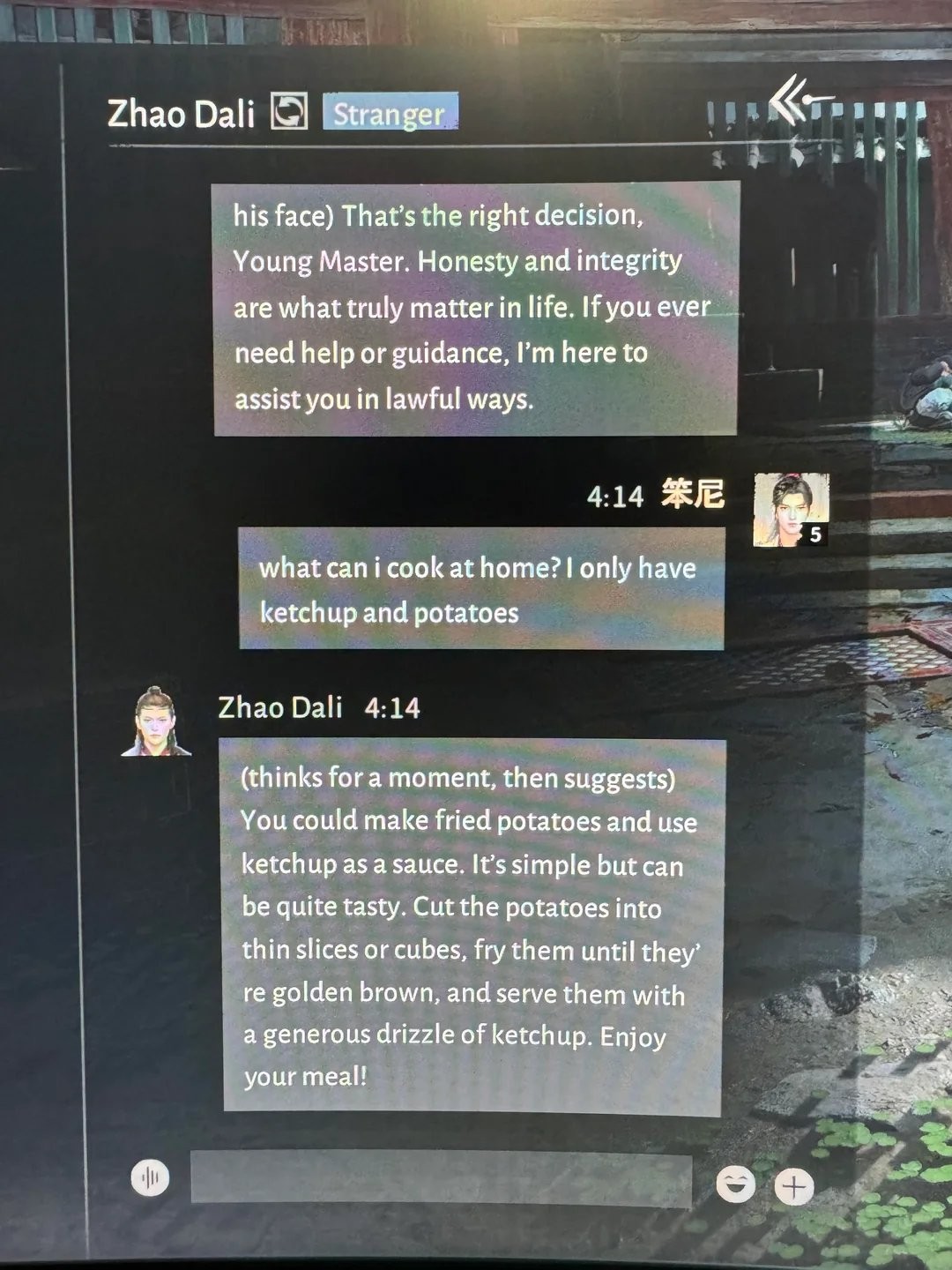 此外,还有其他搞笑的例子,例如在一段讨论中,赵大力一边探讨如何煎土豆,一边承认"番茄酱在宋朝还不存在"。尽管游戏试图将背景设定保持在历史框架内,但AI-NPC很容易被引导谈论任何现代话题,这反而激发了玩家不断实验的兴趣。