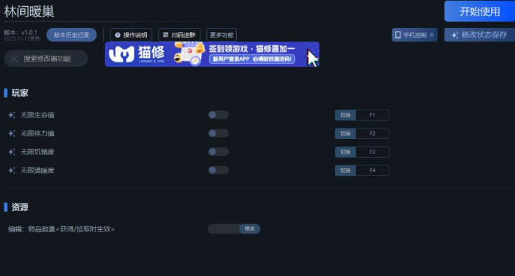 林间暖巢是一款关于一只小老鼠回到家中修复其童年住处的温馨森林生存游戏。玩家将在游戏中探索、收集资源、制作物品、编织温暖的毛衣、烘焙馅饼,并与当地居民交流。这次为大家带来一修大师制作的林间暖巢五项修改器,快来试试吧。