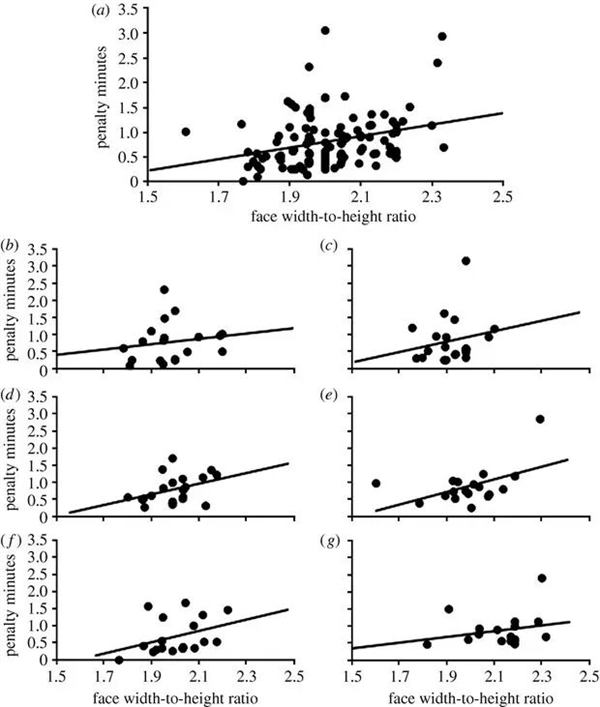 六支加拿大球队的男性职业曲棍球运动员的面部宽高比和攻击性行为之间的关系:(a)总体分析,b-g单独球队分析,图源:参考文献 [3]
