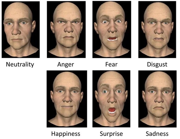人类是面部非常明显的生物,面部表情在我们的交流沟通中传达了许多信息,因此我们自然可以从丰富的面部表情中寻找到信息,比如下图是中性表情和六种基本情感的 3D 模拟,相信大家可以自然从其中感受到相应的情绪[6]。
