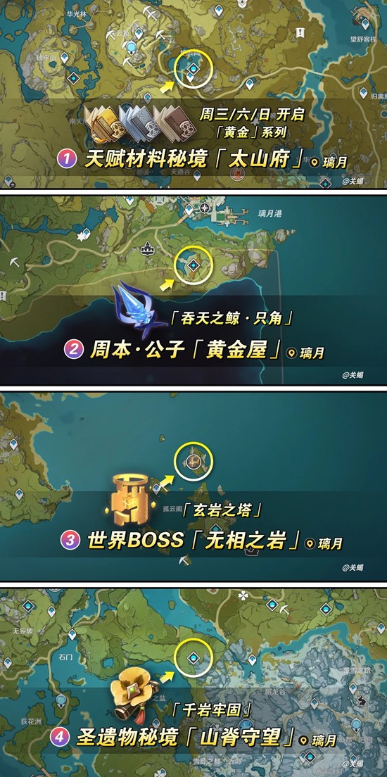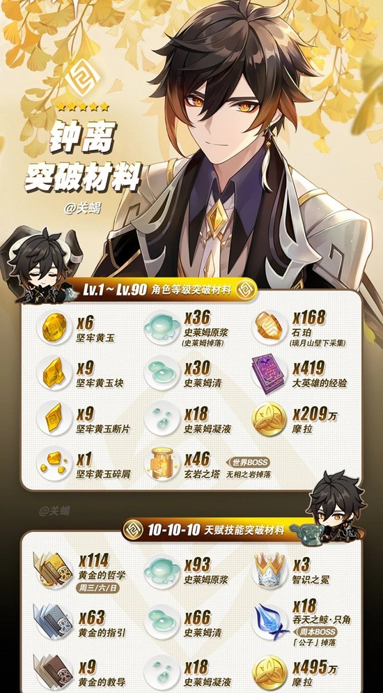 包含角色等级「1~90」和天赋等级「10-10-10」所需要的材料清单;天赋、周本、各BOSS、圣遗物等材料秘境挑战位置,以及采摘收集类材料位置路线图。