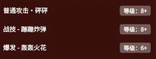 如果在轰轰火花持续期间内退场,会引发爆炸,造成555%攻击力的火元素范围伤害。