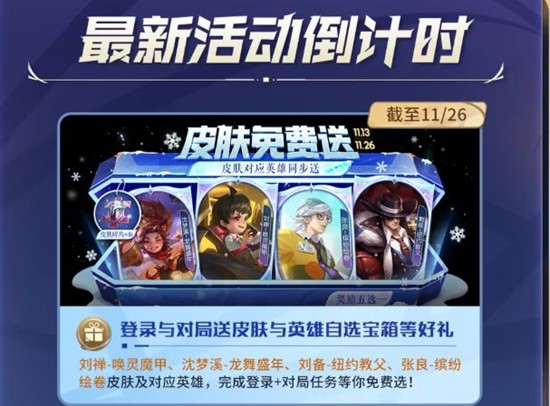 截至11月26日,玩家可以通过登录和参与对局来获得免费皮肤和英雄自选宝箱等好礼。此次活动涵盖了刘禅-唤灵魔甲、沈梦溪-龙舞盛年、刘备-纽约教父、张良-缤纷绘卷等皮肤及对应英雄。完成登录和对局任务,玩家即可免费选择心仪的奖励。