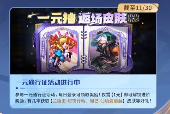 截至11月30日,一元通行证活动正在进行中。玩家只需支付1元即可参与抽奖,有机会获得兰陵王-幻夜行动、妲己-仙境爱丽丝等珍贵皮肤。每日登录还可领取额外奖励,增加了活动的吸引力和参与度。