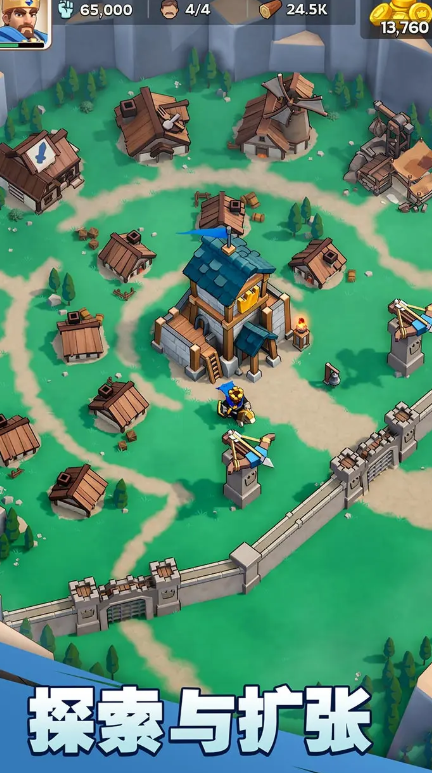 该游戏巧妙结合了塔防战斗与模拟经营两大玩法模块。开局阶段,玩家需操控领主参与防御战役,利用虚拟摇杆触发技能指令,指挥随从单位协同作战,有效击退来袭敌人。胜利后可获得金币与建筑材料,这些资源是后续发展村庄的基础保障。