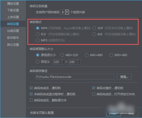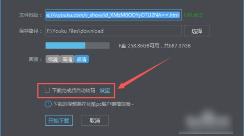 点击优酷PC客户端,在下载视频时弹出的对话框中就有转码提示,勾选前面的方框,客户端会在下载完成后自动进行转码。