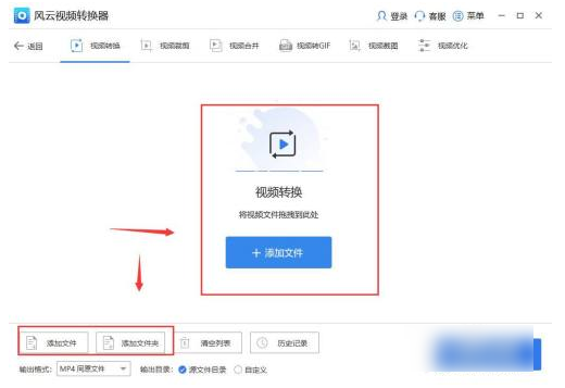 选择点击中间的“添加文件”将所需转换的视频导入。如果需要批量添加,可以点击左下方的“添加文件夹”选项。