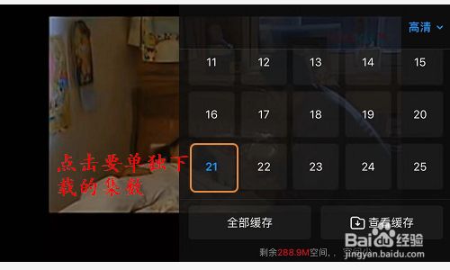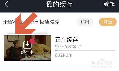 这样右侧会弹出一个窗口,我们点击窗口中的“缓存”然后单击要下载的集数就可以只下载当前视频了,在我的缓存界面可以看到目前正在下载的视频,如图所示...