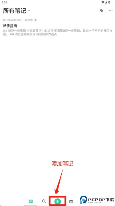 1、点击中间的【+】添加笔记。