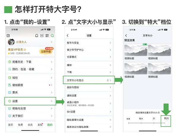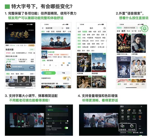 为满足中老年用户日益多样化的娱乐需求,提供更贴心便捷的观影体验,近日,爱奇艺APP上线“特大字号”功能,一键即可全面实现页面及核心功能适老化,为中老年用户提供更加清晰便捷、高品质的娱乐服务。