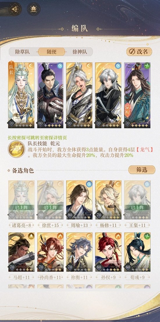 陈登需要觉醒(25增伤)、徐庶6000攻、增伤拉满,诸葛亮免伤拉满,全员需要1.3w血以上,王粲1.8w血(差点站不住)