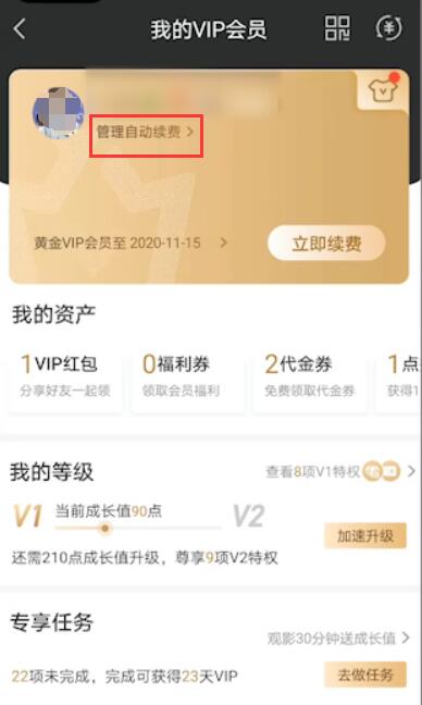 打开爱奇艺,点击我的页面,点击黄金VIP会员,管理自动续费。