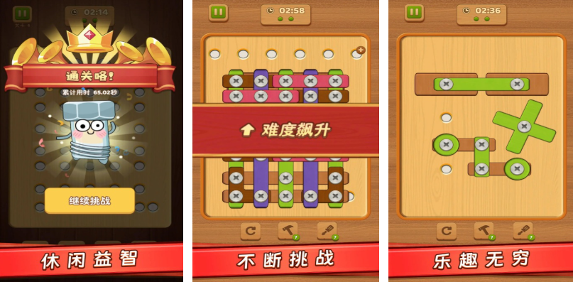 本作是款有着益智休闲气氛的螺丝钉系列解谜手游,挑战性十足的各类螺丝钉解谜关卡互动性极高,多样的解谜解谜方式也是乐趣无限,各种颜色的钢板被螺丝钉封印在画面中,玩家则要一步步将螺丝钉拧下来并拆下钢板,休闲健脑的游戏模式带来的解压互动体验更爽,欢迎解谜游戏爱好者尝试与螺丝钉互动闯关。
