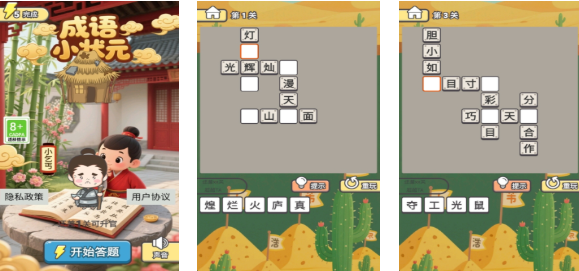 成语小状元是款完美继承了成语精髓的免费版解谜手游,充满创新的成语猜谜、答题玩法带来了更多的乐趣,游戏画面简约但有着超多成语互动的模式,很超前的成语解谜闯关内容也使得玩家更为沉浸,大量成语知识注解让玩家领悟了成语的含义,精彩好玩的成语解谜环境营造令成语爱好者大呼过瘾。