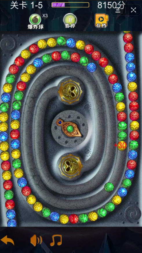 采用十分精彩的祖玛玩法,玩家需要发射不同颜色的弹珠在轨道中,当三个相同颜色的弹珠碰击在一起将会被消除,每消除三个弹珠就可以获得相应的分数,每一个关卡的弹珠数量都是不同的,总共有100多个关卡,玩家可以逐步的去解锁新的关卡,在新新的关卡中不断的去挑战自我,最后剩的弹珠数量越少,得分就会越高。