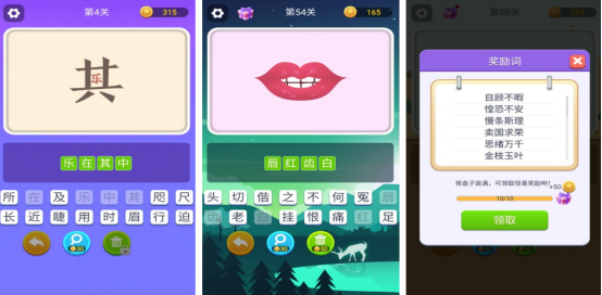 包含成语数量极其丰富,每个关卡中都有不同的题目类型,在每次开局之后率先会看到一张特别精美的图片,图片上的画面展现特别真实又生动,有的是用文字展现,有的是用画面所展现。而下方又会有多个单个的汉字,大家要根据自己所学的知识猜出正确的成语,每次回答正确后,都会获得金币奖励,关卡中还有很多辅助道具,包括放大镜或者是刷新等。