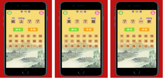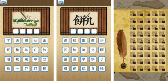 秉持寓教于乐的核心准则,让所有玩家在玩游戏的过程中学到更多成语知识,所有的关卡都可通过逐渐解锁的方式来挑战,因为在每个关卡中都会有不同的图片,就比如在一张图片中可以看到繁体字饼,然后还有一根毛笔等等。这张图片虽然特别独特,但是可能刚开始看到的时候,很多人都不知道正确的成语答案是什么,要结合自己所学的知识猜出来。