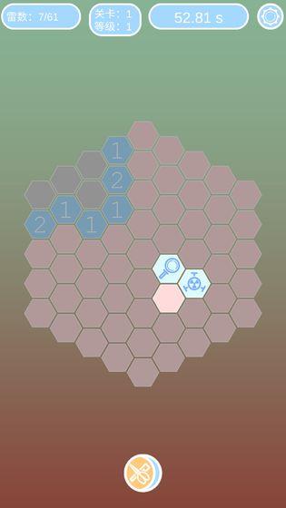 一个把传统扫雷游戏的放个地图改成了六边形网格地图的游戏,虽然仅仅只是这么一个小小的变化,但是相邻格子上显示的数字交叉范围更大,提高了玩家推理地雷位置时的难度。操作上并没有什么改变,依然是单击掀开格子,长按标记地雷等等,为了提升游戏的趣味性,设计者还加入了计时挑战和带特殊规则的解密关卡。