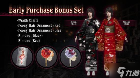 另外还有早期购买特典:饰品“牡丹发饰(绯红)”、“牡丹发饰(二蓝)”;服装“和服(绯红牡丹)”、“和服(墨色彼岸花)”;道具“护身符·怨”。