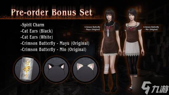 预购特典有:饰品“猫耳发箍(白)”、“猫耳发箍(黑)”;服装“红蝶·澪”、“红蝶·茧”;道具“护身符·灵”。特典商品可能于日后提供付费或免费下载。护身符所附带的效果,可能会随游戏推进通过其他方式获得。