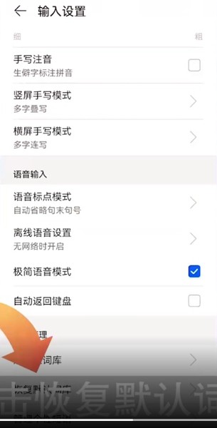 3、然后选择输入设置选项进入最后点击恢复默认词库即可。