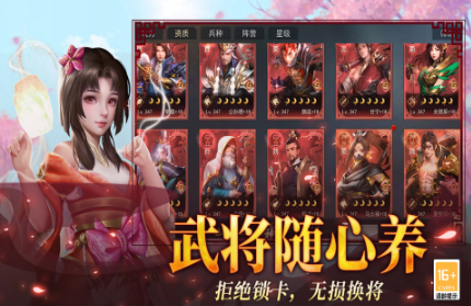 该游戏以三国历史为题材,主打策略回合制战斗。五大兵种自由搭配,形成多样战术组合,没有固定套路限制。玩家可通过收集卡牌不断扩充军队规模,在征战城池的过程中体验养成与布局的双重成就感,最终目标是统一乱世,成就一方霸主。
