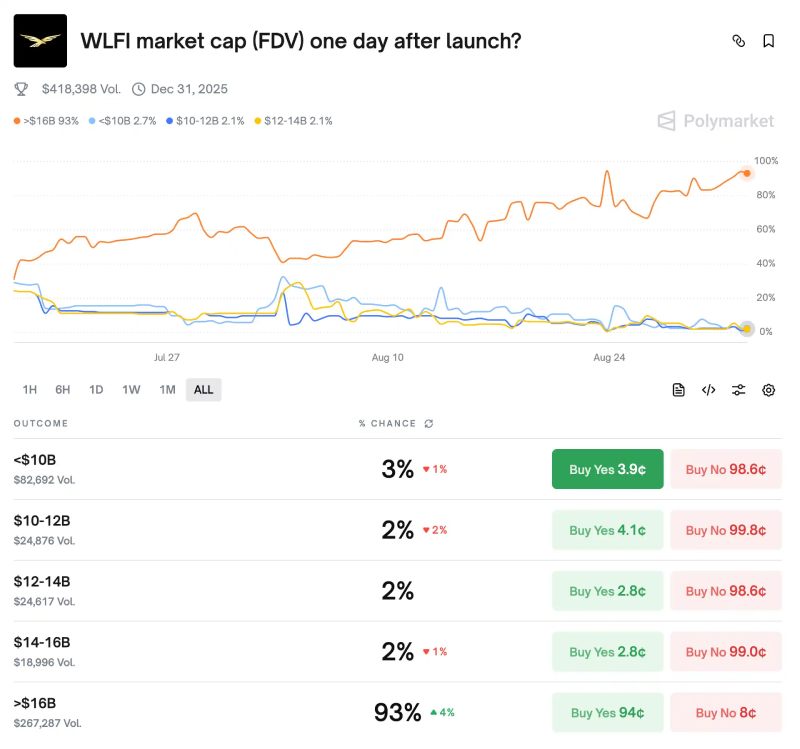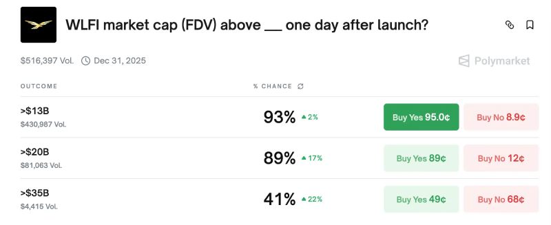 现在 Polymarket 上有两个关于 WLFI 的赌注,都是关于 WLFI 上线当天的市值,只是一个是分档市场(<$10B、$10–12B…、>$16B 五选一),第二张是阈值市场(>$13B、>$20B、>$35B 三个二元判断)。