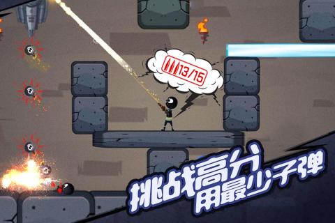 一款创意十足的横版射击闯关手游,玩家通过滑动控制火柴人角色移动并调整射击角度,利用墙壁反弹子弹来击杀敌人或解救人质。每个关卡限定子弹数量,必须在耗尽前完成任务目标。游戏包含200多个关卡,随着进度推进,地形愈发复杂,敌人数目增多,但也会解锁分裂弹、火箭炮等强力武器。场景中设置爆炸桶等互动元素,巧妙利用可大幅提升通关效率。