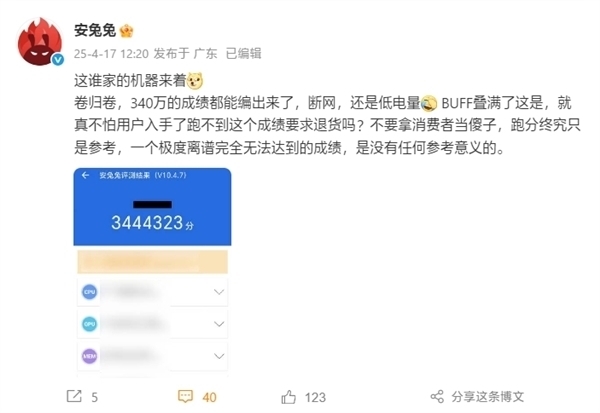 当时其实验室低温跑分达到了344万,远超其他所有机型,还引发了安兔兔官方的质疑,直言这是P图。