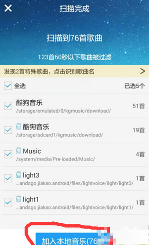 扫描完后点“加入本地音乐”。这样就可以将你手机里面的所有歌曲添加到酷狗音乐里面了