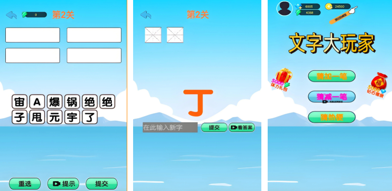 文字大玩家是款将文字游戏魅力塑造到极致的免费大玩家手游,每个玩家都会成为文字小天才与游戏关卡互动,超多的文字主题解谜任务带来的沉浸感不差,比如看图识字跟加一笔变新字等超有趣的任务,本作画面很简单展现出的汉字知识也更多,很高互动性提供的文字交互理念也相当特殊,提示功能十分良心足以加快文字闯关的速度。