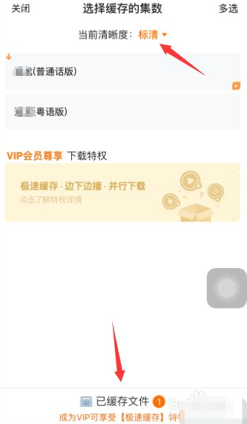 然后会让你选择缓存的集数,以及选择视频的清晰度,默认是“标清”的,如果网速快,可以选择“高清”或者“超清”,选择好要下载的视频之后,比如选择了普通话版,然后点击下方的“已缓存文件”,如图所示。