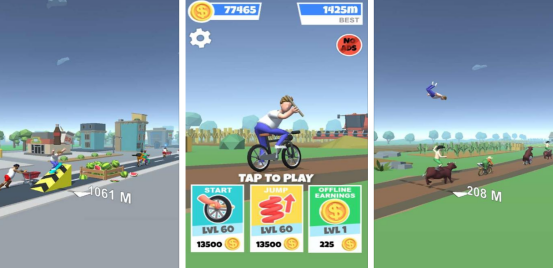 跑酷玩法和自行车相互碰撞,因为自己的自行车总是会遇到很多难题,比如自行车轮子被棍子卡住。或者赛道上突然间出现各种障碍物等等,那么此时就可通过跳跃以及反弹的方式跳得越来越远,只要跳得越远,获得的分数就会越高。其实此游戏比较锻炼的就是大家的反应能力,沿途还会有大量金币等大家收集。