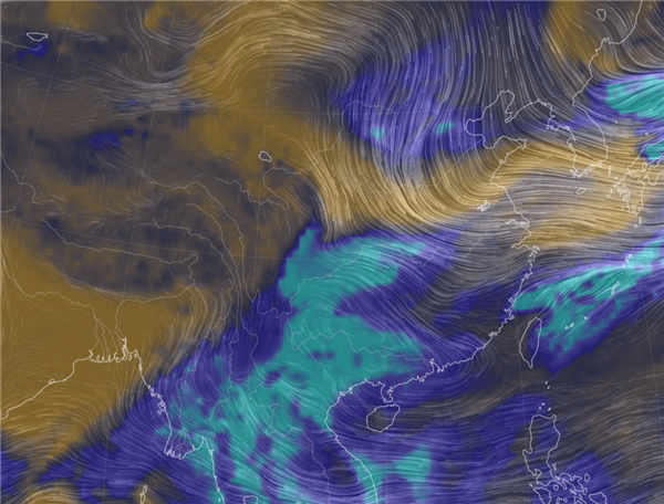 16 日夜间约 5500 米高空的相对湿度和风场,可以看到华北的大范围较高湿度区,北京位于其边缘(从棕黄色到蓝绿色湿度不断增大)。图片来源:earth.nullschool.net