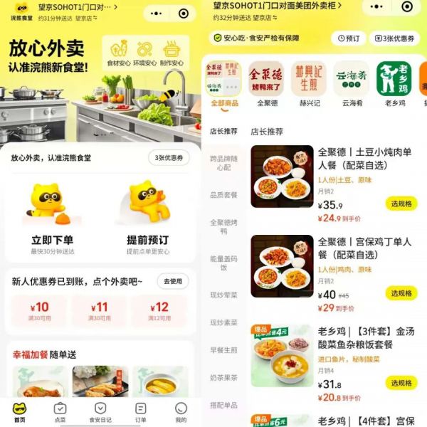 浣熊食堂在线上有两个入口,一个位于美团外卖App的功能频道内,与拼好饭等热门业务并列;另一个则是通过微信搜索浣熊食堂小程序,即可使用体验。