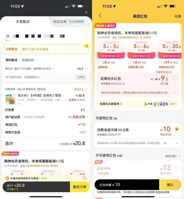 图注:左为浣熊食堂外卖支付界面,右为美团外卖支付界面。