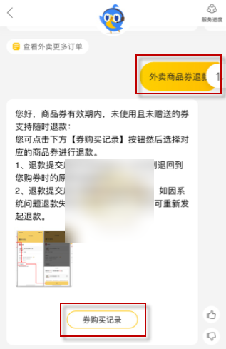 2、进入客服窗口,点击外卖,输入商品券退款,获得券购买记录入口,点击;