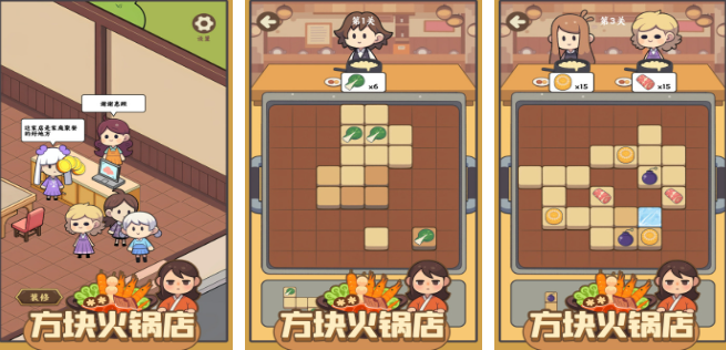 方块火锅店将三消机制与餐厅经营融合,玩家通过消除方块获得食材,满足顾客订单获取金币扩展店铺。核心流程围绕接待展开,每位顾客提出不同食材需求,玩家需调整方块布局达成消除条件,完成订单提升满意度。