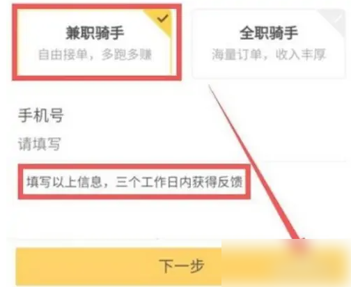 最后选择兼职骑手选项,点击下一步。等待审核通过就可以成为兼职骑手了。
