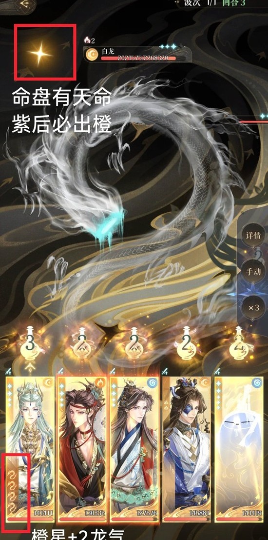 一回合:亮至少有4层龙气+满能量+紫星时,亮↑
