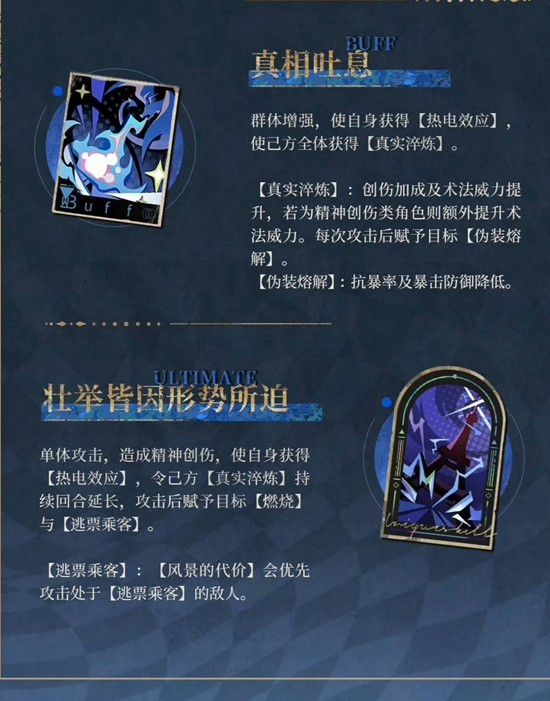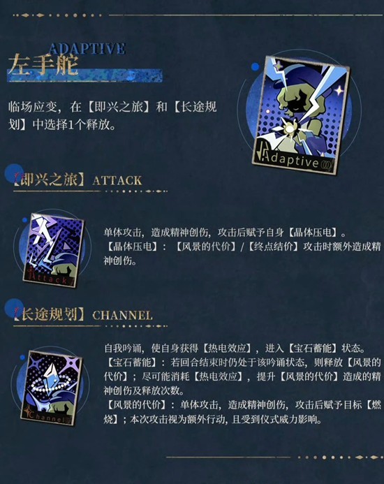 至终的仪式(大招)不占手牌上限;给电场充能或赋予敌方燃烧时会获取热电效应,热电效应能进一步获取激情。
