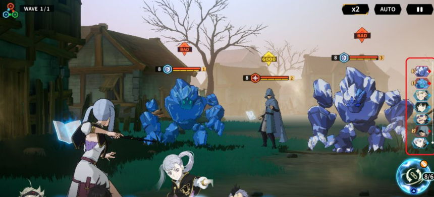 战斗中最需要注意的就是右侧的行动条,根据角色的速度和技能效果来抢占先手。如果你能合理选择属性克制攻击敌人,打出的伤害会高很多。比如风属性克土,土属性克水,合理选择能打出更高的输出。战斗的节奏也很重要,时刻注意敌人的技能释放时机,适时使用控制技能,保证不被敌人反击。