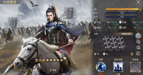 霍去病:属于一个辅助性的核心,有104个攻击,还有104个防御力。全军冲锋的主动技能,可以有效提升80%的侧翼步兵速度,还可以给全体骑兵提供35%的减伤。在面对主流阵容时,10秒到12秒的远程免伤伤口还可以更好的保护输出。如果是和孙武搭配在一起,就可以和前排之间形成完美的衔接,在团队过程中也有出色的容错率。