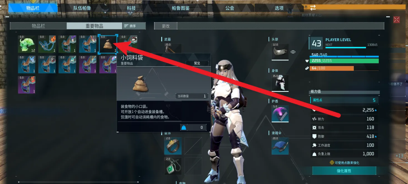 进入【重要物品】界面之后,玩家会看到一项名为【小饲料袋】的物品,这个道具是给帕鲁喂食的必备工具。要用这个道具给帕鲁喂食,玩家需要先将其装备上。装备好之后,你就可以继续往下操作了,接着就到了给帕鲁喂食的具体步骤。