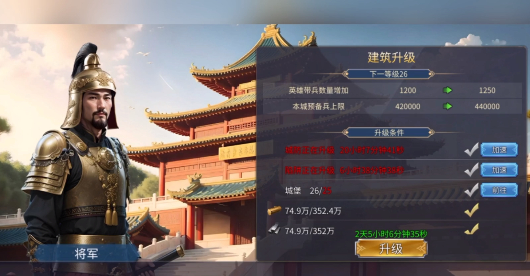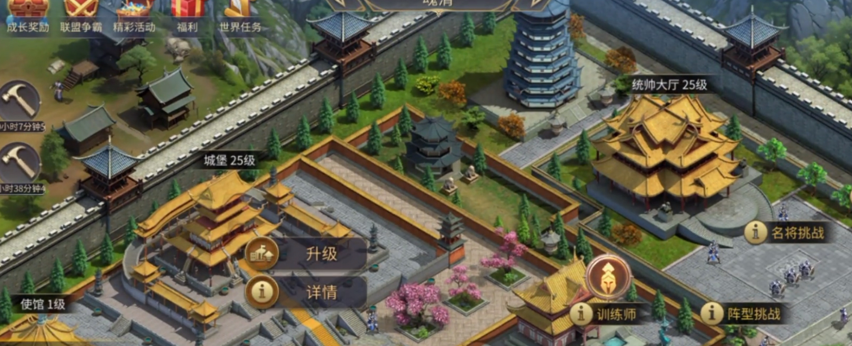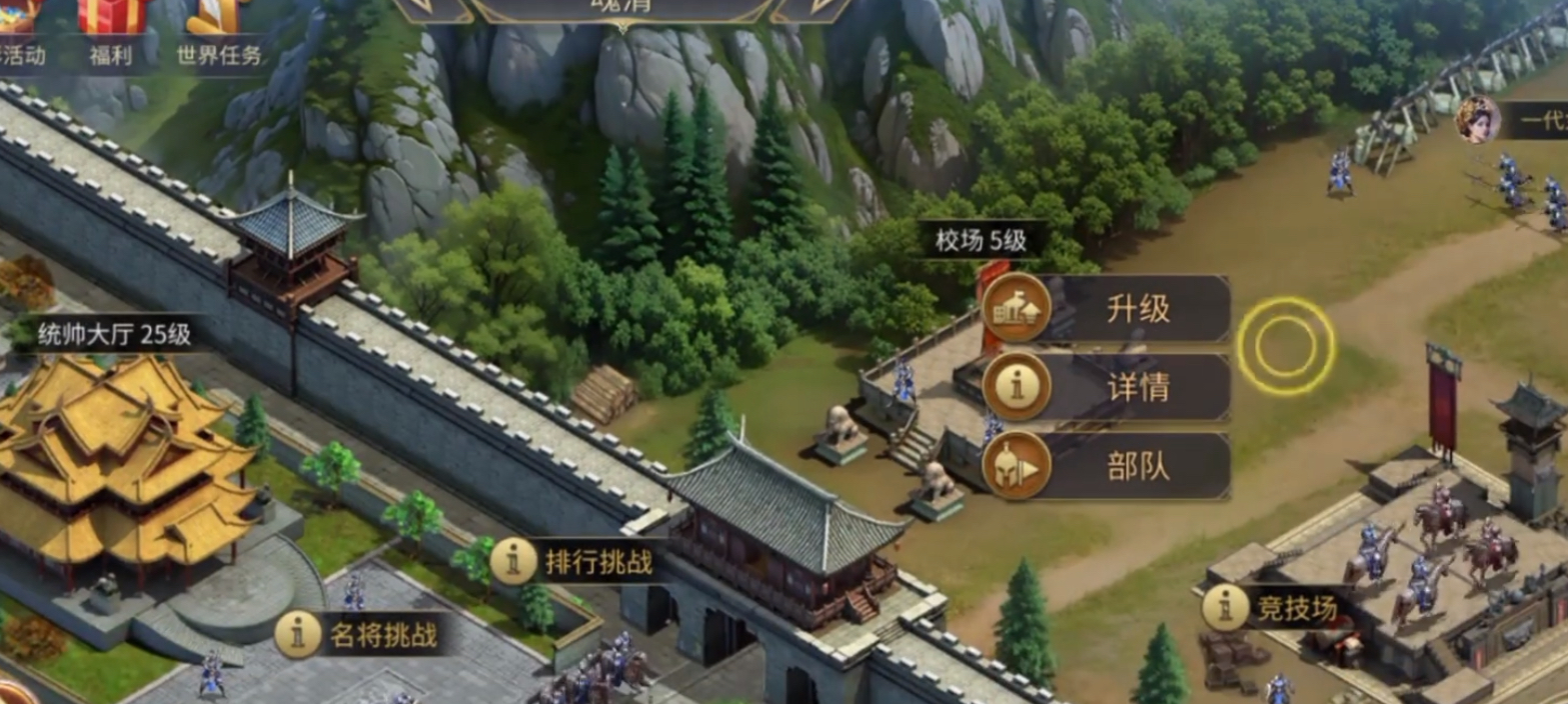 如果升级完主城和其他资源建筑大家的资源充足的话,就可以将统帅大厅,校场和兵营这三个建筑进行升级,因为它们是直接和我们的战力挂钩的。而且在前期我们的任务大多数都是清野怪,所以兵营的升级也是势在必行的,升级之后可以加快我们招募兵力的速度。另外,前期开荒阵容的话推荐大家尽量用四星的武将,比如三弓两步是比较稳妥的,很适合用来前期开荒。