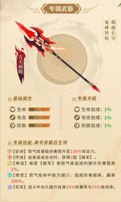 尽管初始属性加成看似有限,但随着专武等级提升,其潜力逐步释放。当武器进阶至史诗品质时,将激活怒气机制的额外伤害加成,基础伤害提升高达130%。而当吕布自身达到传说品阶后,使用专武击杀敌方单位可立即叠加两层“破军”状态。此为吕布独有的增益机制,每层提供5%吸血与5%减伤,最多可叠加至4层,极大增强持续作战能力。