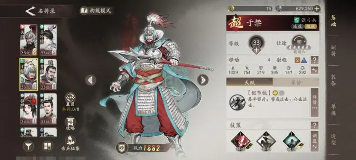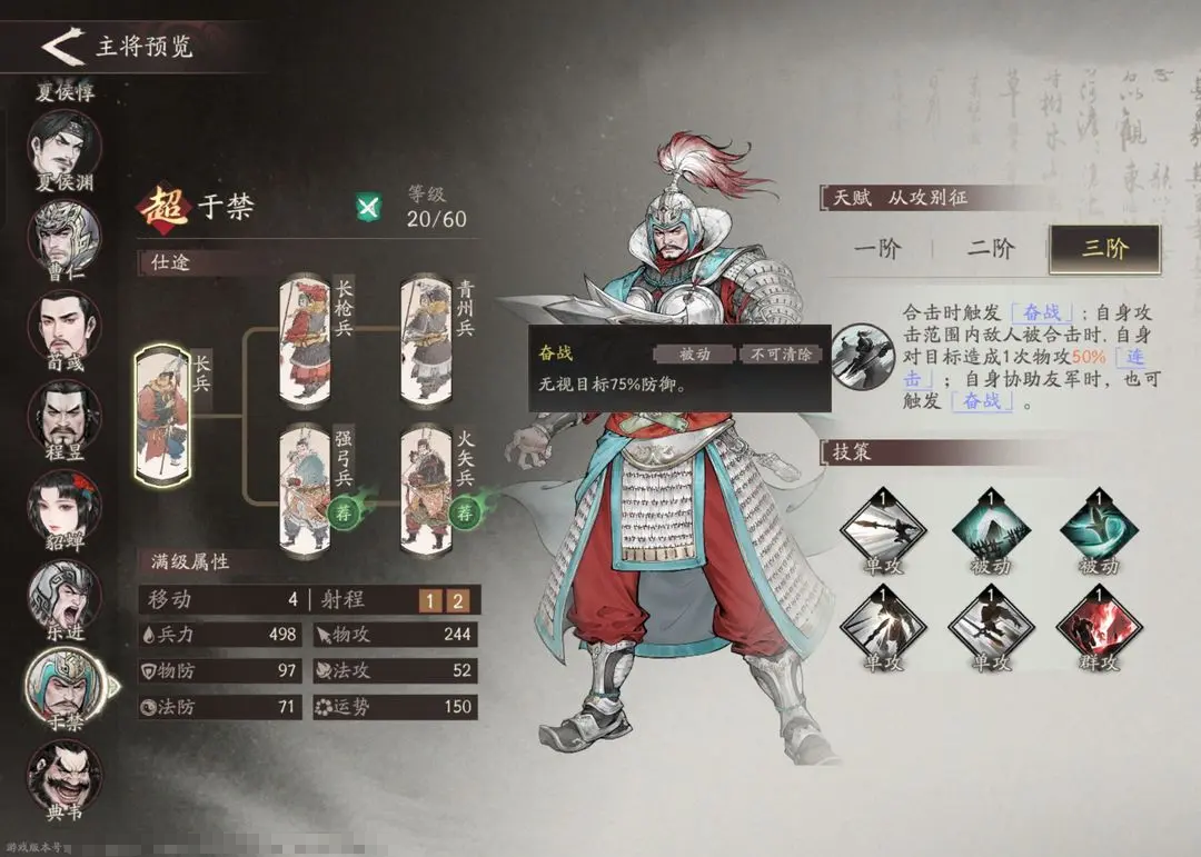 关于阵容组合,最佳搭档无疑是程昱。程昱可通过携带“刚戾鬼谋”类技能,显著提升合击发生的频率,进而让于禁的天赋得以高频次触发,实现稳定追击输出。另一位强力辅助人选是貂蝉,她具备出色的再行动能力,有助于延长回合链条,创造更多合击机会;若暂时没有貂蝉,使用乐进作为替代也是不错的选择。