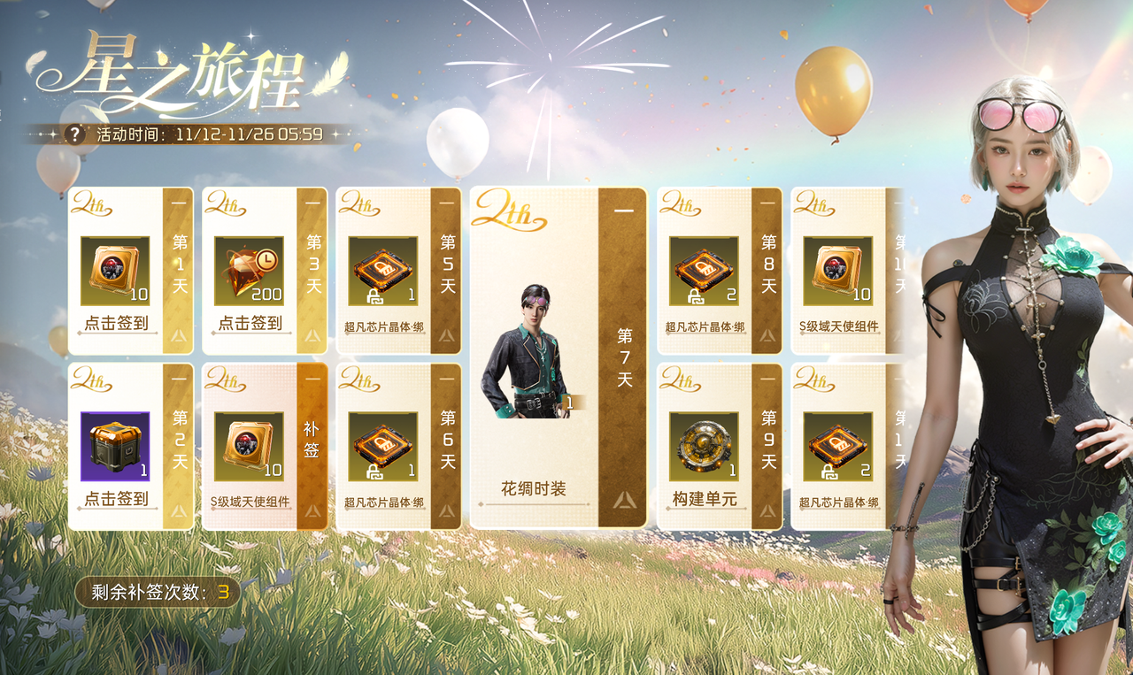 每天登录即领限时晶核、S级域天使组件等,累计签到7天,周年限定「花绸」时装免费抱走!累计签到14天,还有武器皮肤免费拿!就算不小心忘签也不怕,补签3次帮你兜底,所有奖励一个都跑不掉啦!