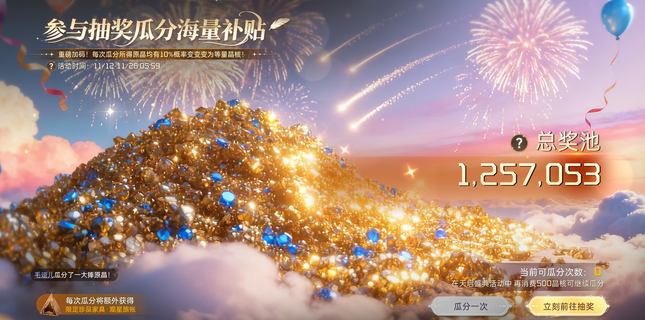 百万补贴暴击来袭,参与天启盛典抽奖直接瓜分海量原晶,更有10%概率触发欧气暴击——原晶秒变等量晶核,血赚一波!关键是每次瓜分都能额外抱走限定珍品家具「观星旅帐」,颜值质感双在线,摆进庄园直接拉满氛围感!这波福利简直是天上掉馅饼,赶紧来试试手气呀~